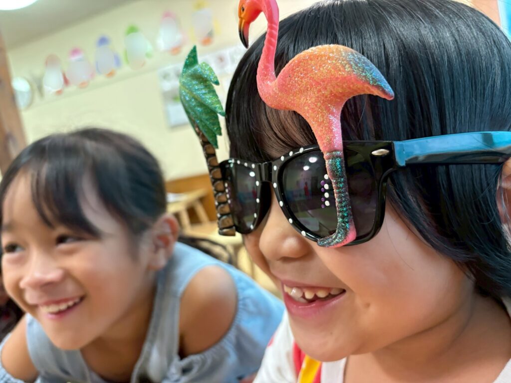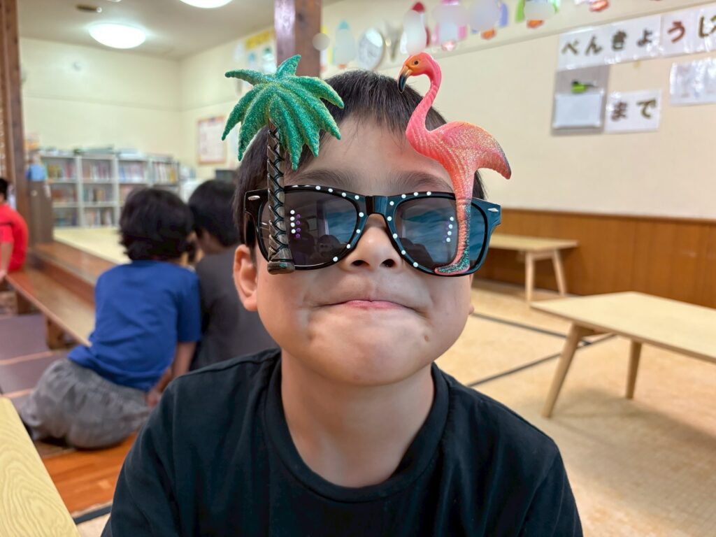 先生がつけていたサングラスを借りてニマニマの笑顔です🦩