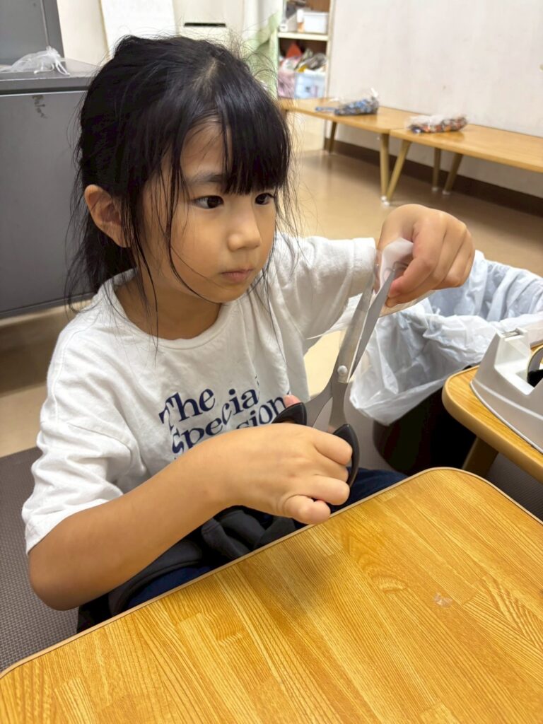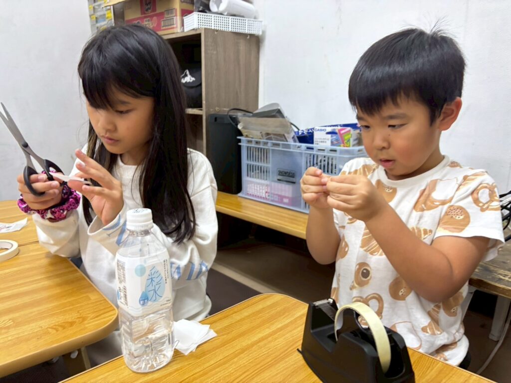 クッキングシートに空気が入らないようにテープをはるのがなかなか難しい!みんな慎重に、ゆっくり。丁寧に頑張りました!