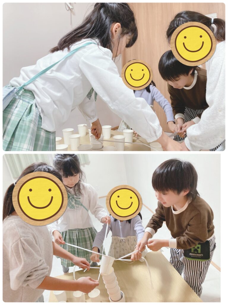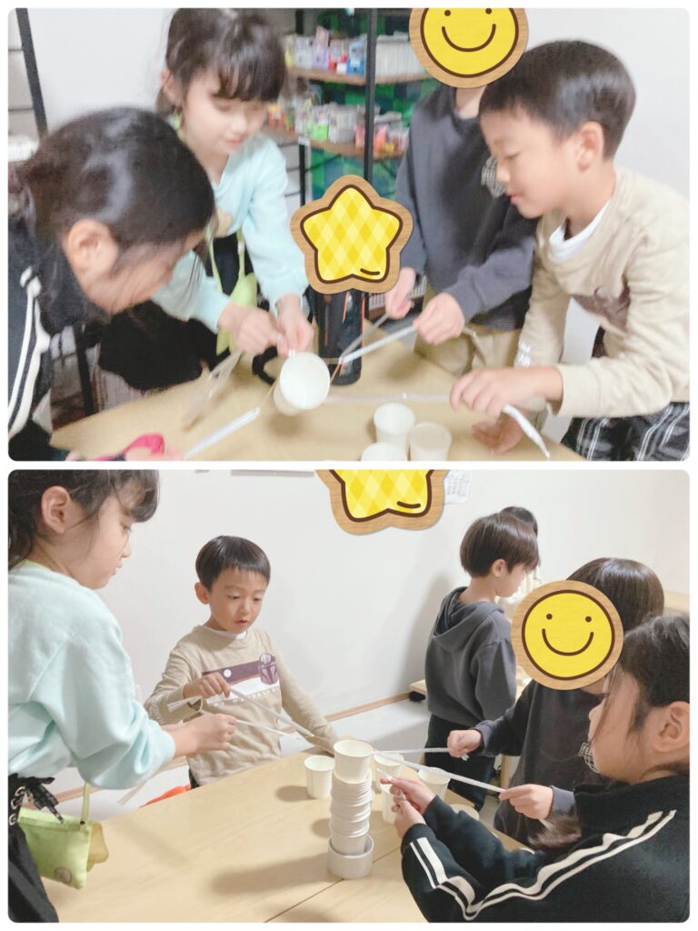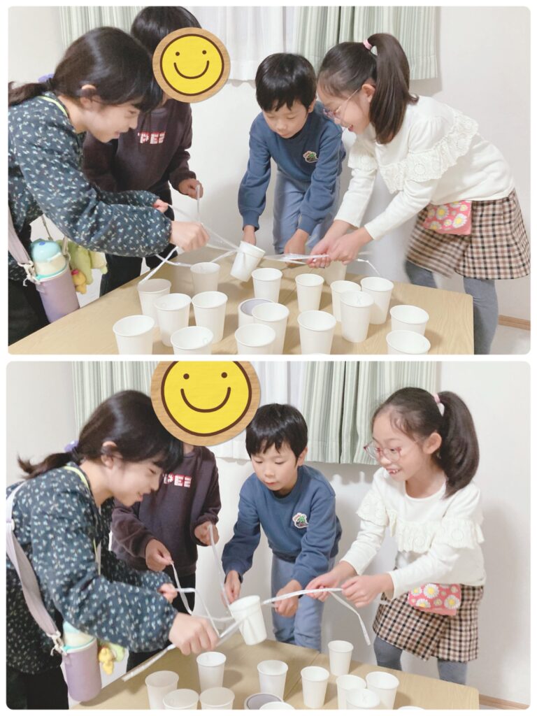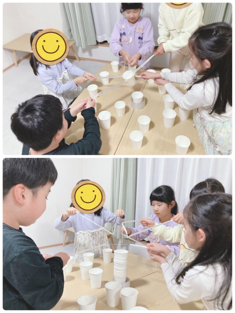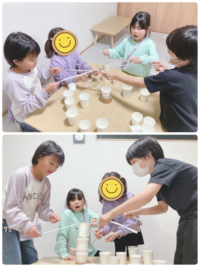 リーダーシップを発揮し、どのコップから掴みにいくか指示を出したり、1年生もやりやすいように高さを調整する上級生、お兄さんお姉さんの動きに合わせて輪っかを引っ張り挟みやすくする下級生と、それぞれが役割を持ち協力し合あう姿が見受けられました😊