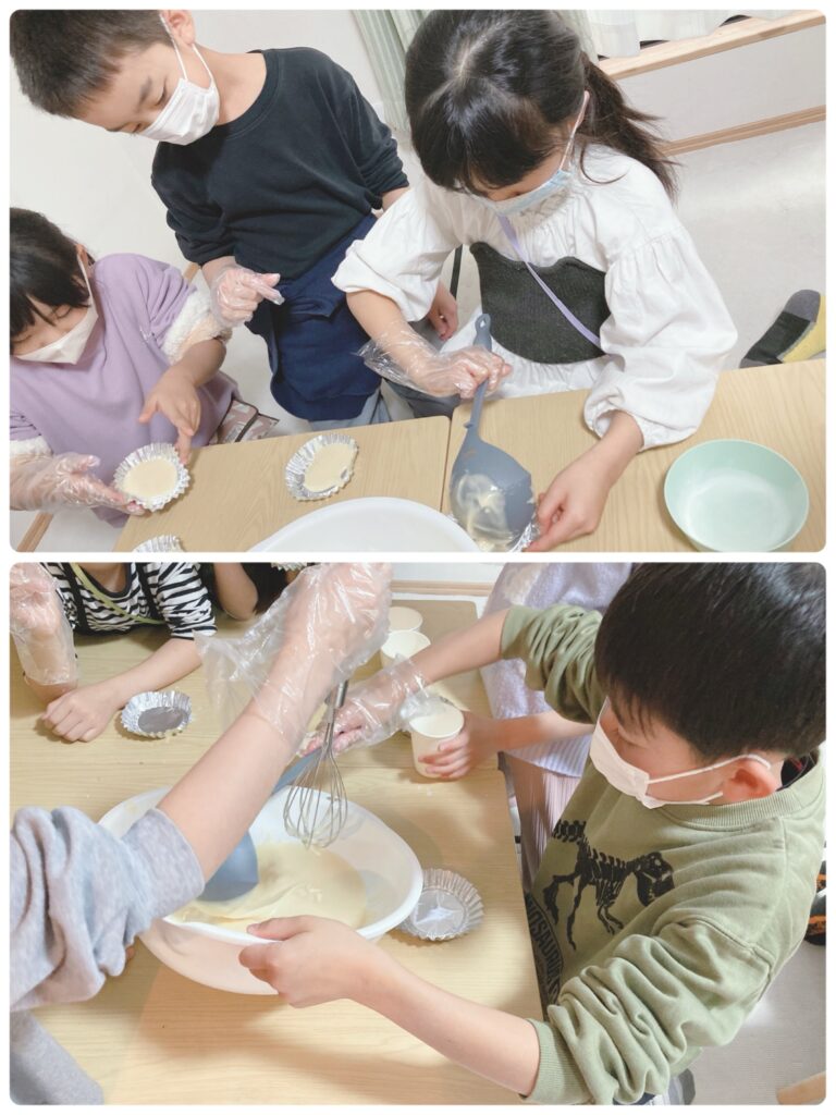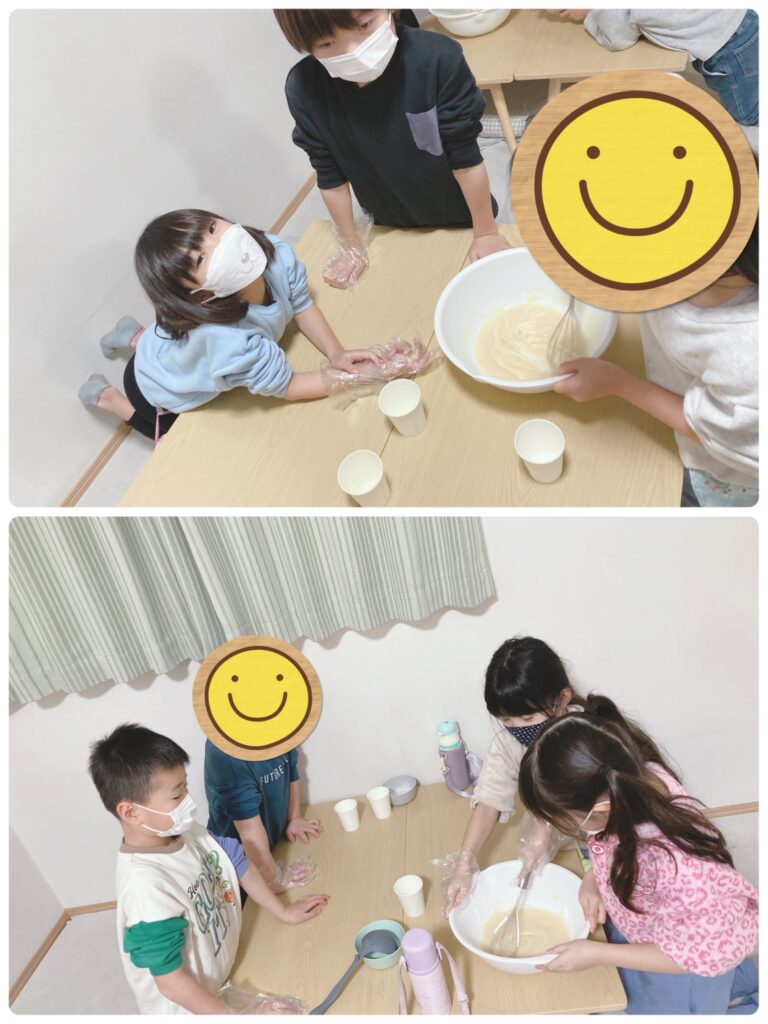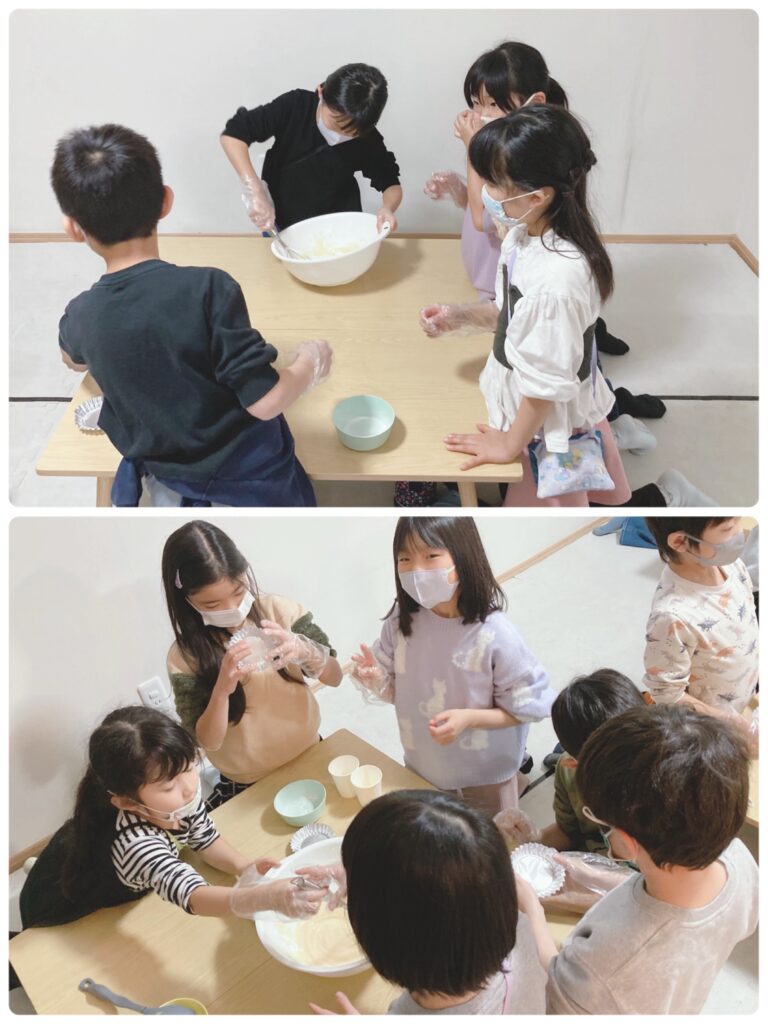 まずは各班ともに材料をボウルに入れ、ひたすらよくかき混ぜます😊