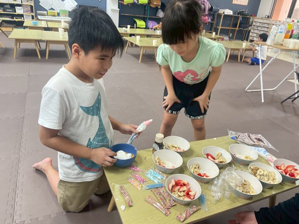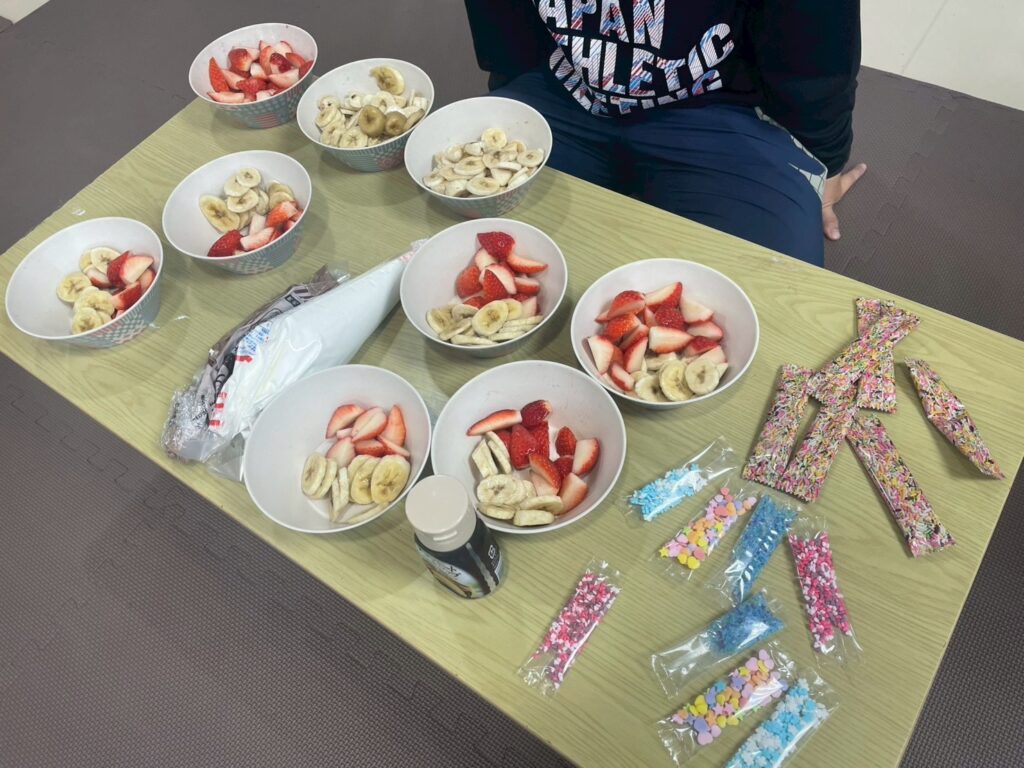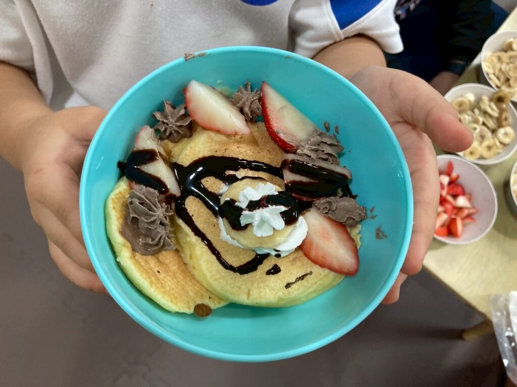 ホットケーキの上にフルーツやクリーム等を自分でトッピングしました!