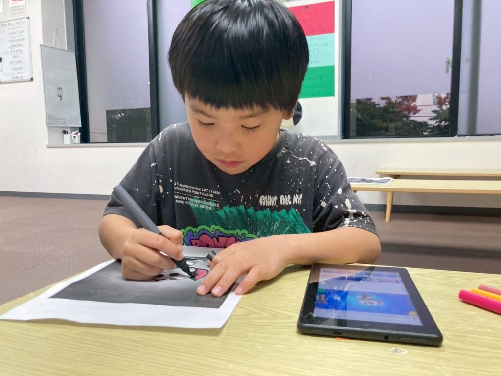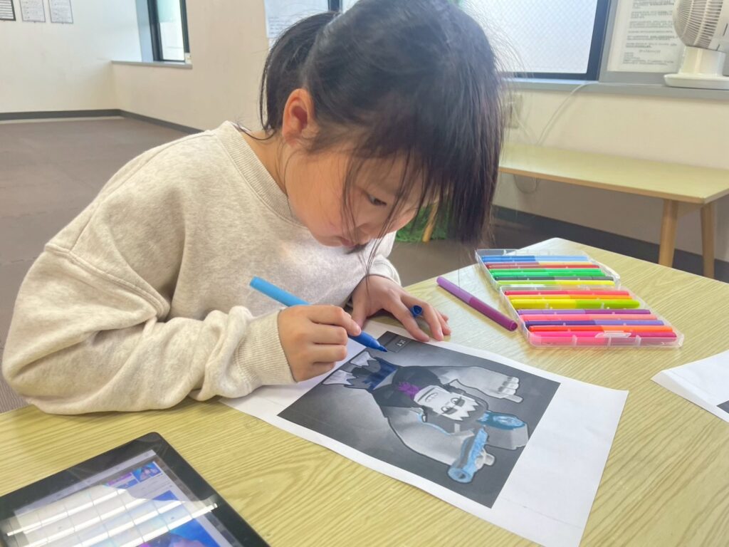 ゲームのキャラクターを印刷して、画像を見ながら上手に塗れていますね!