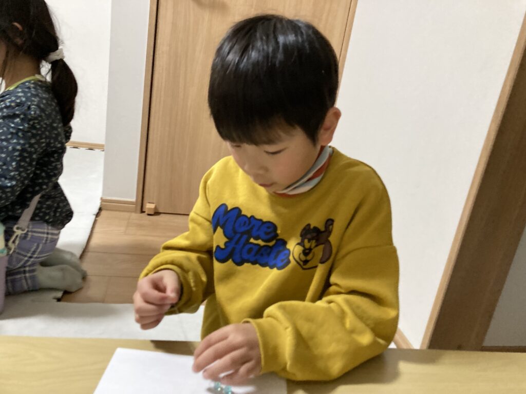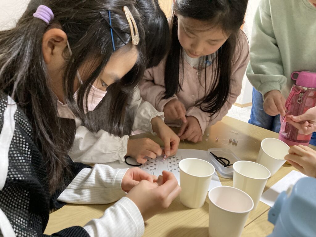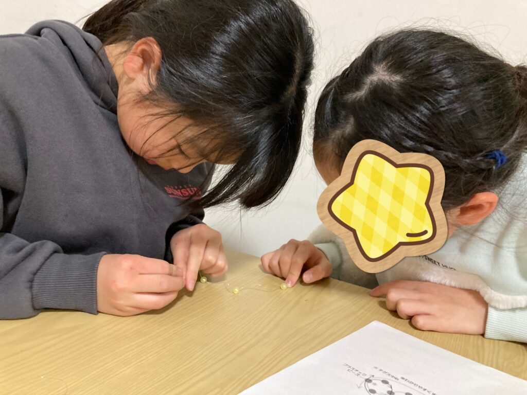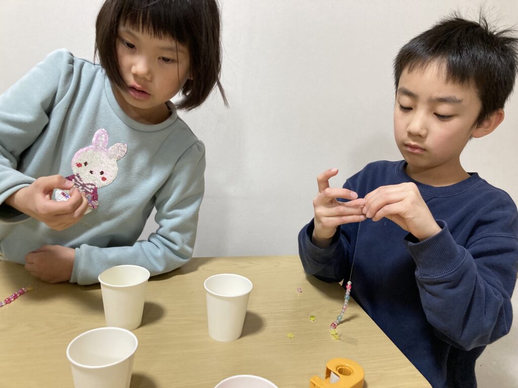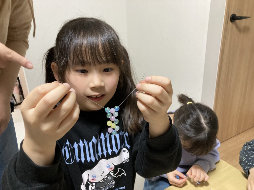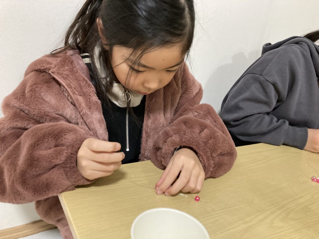 この真剣モードのおかげでみんな無事にビーズをテグスに通し終わりました👏