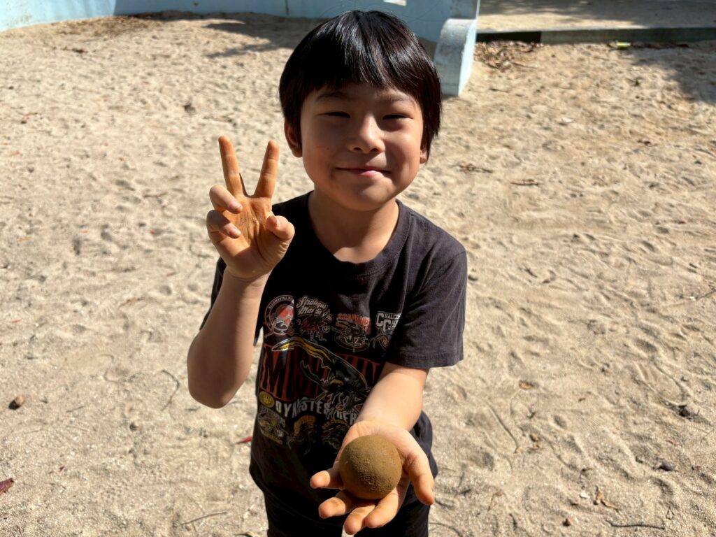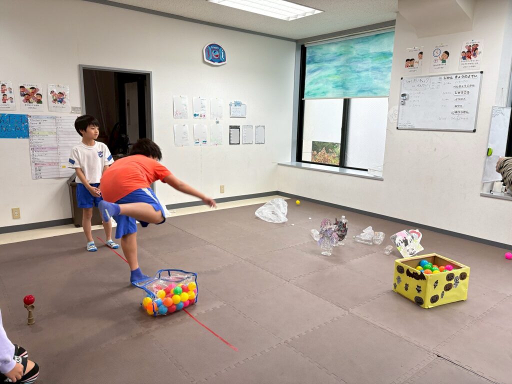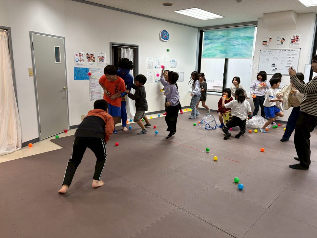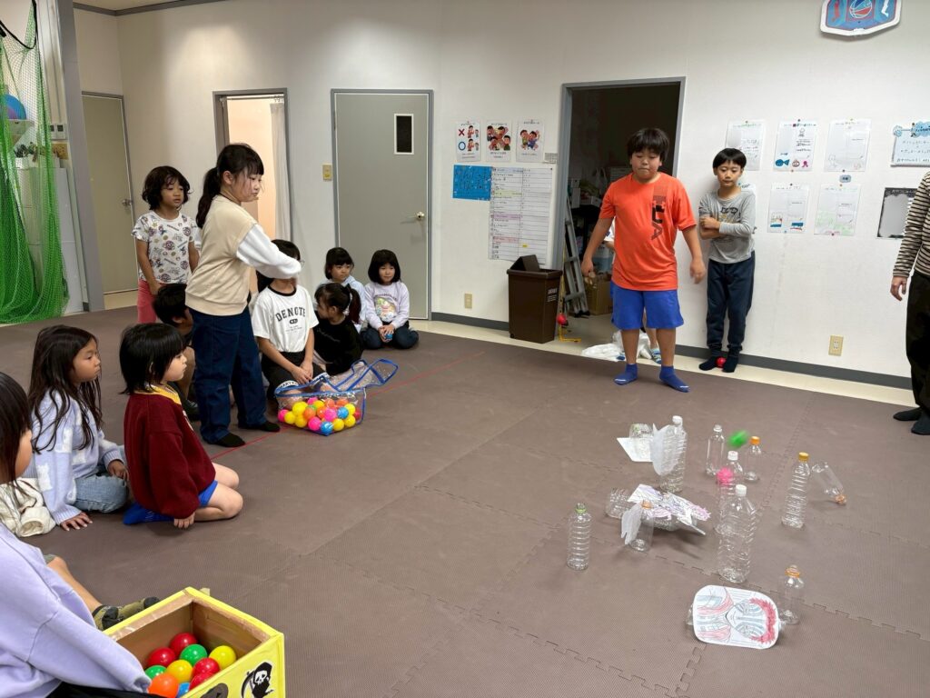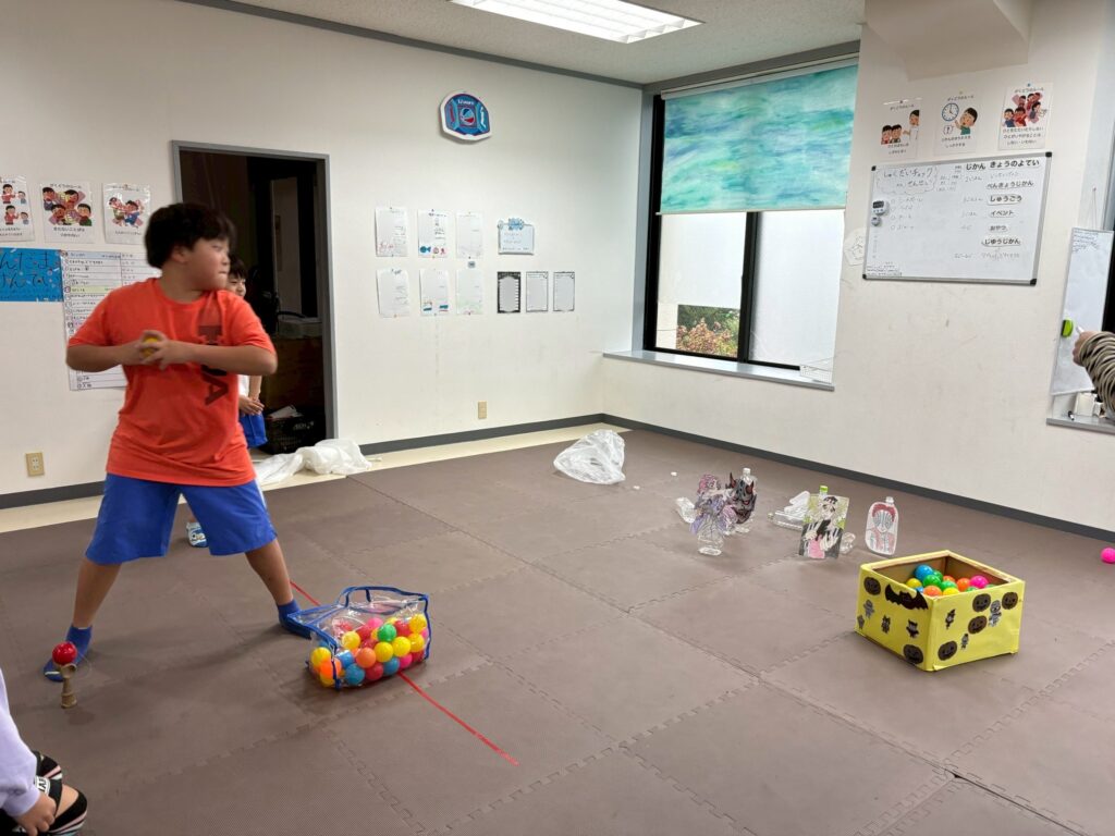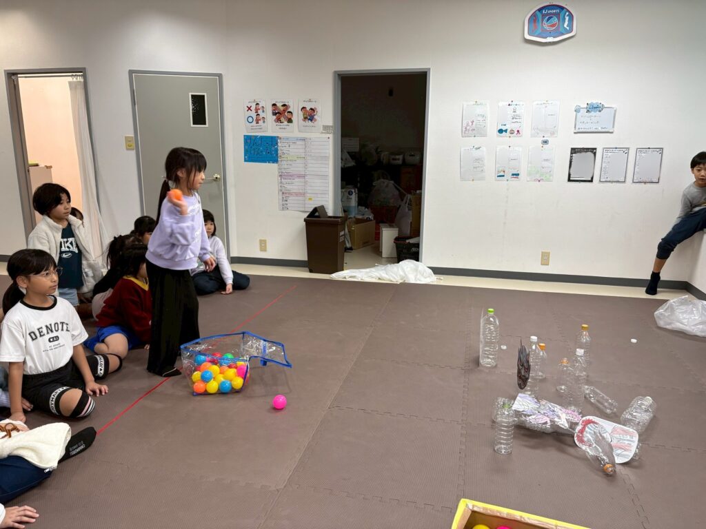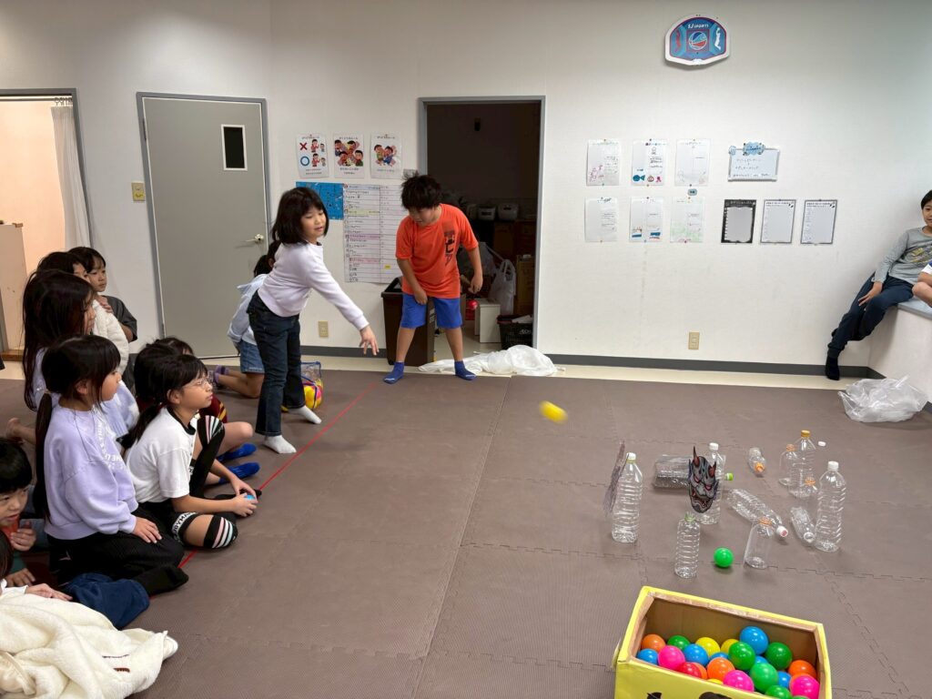 鬼退治の後に、鬼の絵がついているペットボトルを倒すゲームもしました!